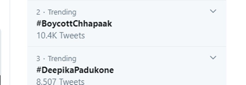 छात्रों पर हमले को लेकर कन्हैया कुमार के नेतृत्व में जेएनयू में चल रहे प्रदर्शन में दीपिका पादुकोण शामिल हुईं। वहीं दीपिका के छात्रों के सपोर्ट में आते ही ट्वीटर पर उनकी फिल्म छपाक का लोग बॉयकाट करने लगे। इस समय ट्वीटर पर दूसरे नंबर पर #BoycottChhapaak ट्रेंड कर रहा है।