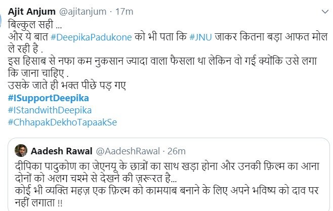 ट्विटर पर लोग दीपिका की फिल्म को बॉकाट करने सहित उनको ब्लॉक और ट्रोल कर रहे हैं। लोग दीपिका के जेएनयू में पहुंचना फिल्म के प्रोमोशन के नजरिए से देख रहे हैं।