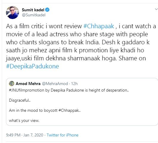 फिल्म क्रिटिक सुमित कडेल ने दीपिका पादुकोण के JNU पहुंचने पर निशाने पर लिया है। सुमिन ने अपना एक पुराना ट्विट को रीट्विट करते हुए लिखा कि पद्मावत के समय आप सही थीं और आपका साथ दिया था लेकिन टुकड़े-टुकड़े गैंग के साथ आप खड़े होकर देश की भावनाओं को ठेस पहुंचाया है।