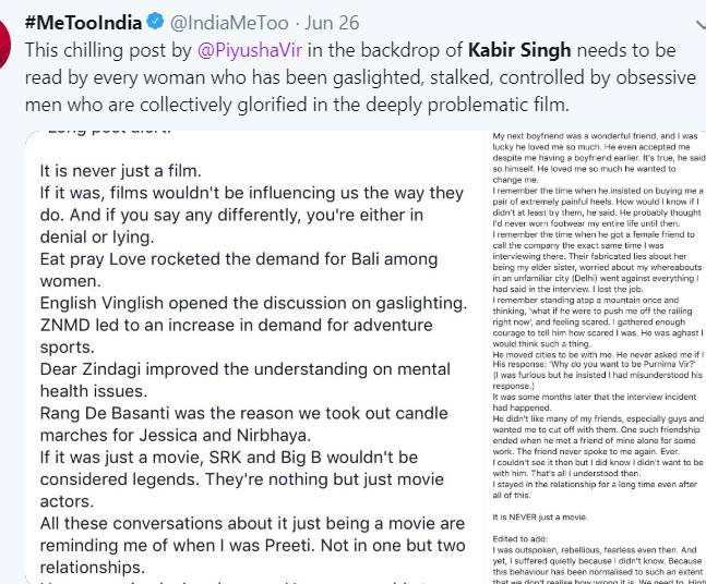 ब्लॉकबस्टर हिट फिल्म के खिलाफ क्यों है लोग? दरअसल, फिल्म में काफी वॉयलेंस दिखाया गया है। वहीं कियारा के किरदार को लेकरकहा जा रहा हैकि फिल्म में उन्हें मात्र शो पीस की तरह दिखाया गया है। जिस तरह से कबीर सिंह महिलाओं पर अपनी चलाता है यह एक गलत उदाहरण है जो पेश किया जा रहा है। लोगों के मुताबिक- फिल्म देखने पहुंच रहे कुछ मेल्स इस तरह के सीन्स में खड़े होकर तालियां पीट रहे हैं जो कि समाज की सोच को दर्शाता है।