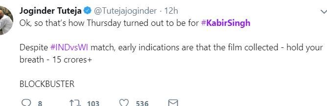 #KabirSingh wave grips the nation… Trending on weekdays is an eye-opener… Should comfortably cross ₹ 200 cr in Week 2… Fri 20.21 cr, Sat 22.71 cr, Sun 27.91 cr, Mon 17.54 cr, Tue 16.53 cr, Wed 15.91 cr, Thu 13.61 cr. Total: ₹ 134.42 cr. India biz.