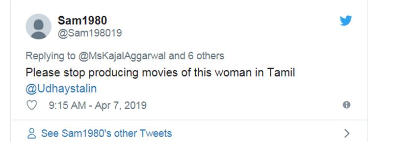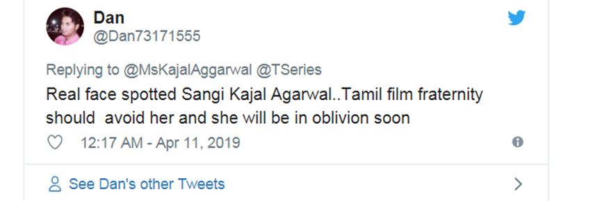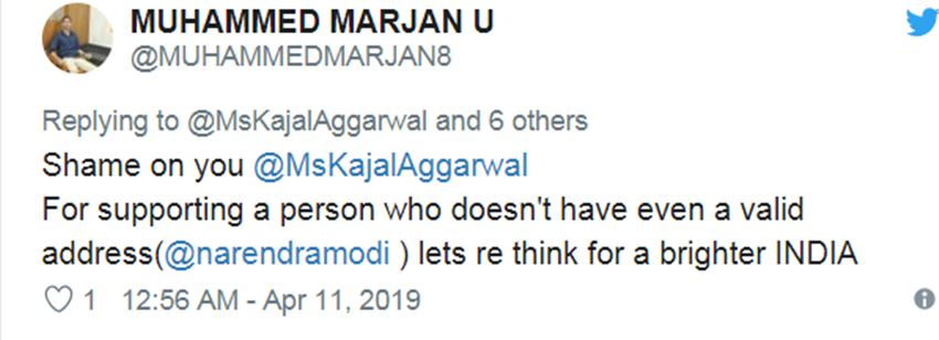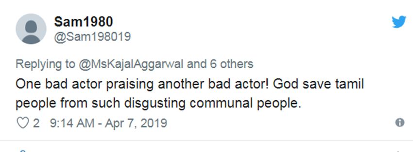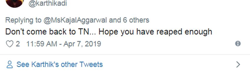 साउथ में एक्ट्रेस काफी काम कर चुकी हैं। ऐसे में साउथ में उनके फॉलोअर्स कहने लगे कि काजल अग्रवाल मोदी सपोर्टर हैं। ऐसे में काजल अग्रवाल को ‘संघी’ कहा जाने लगा। कुछ लोग तो कहते नजर आए कि अब तुम तमिलनाडु वापस मत आना। एक यूजर लिखता , ‘अच्छा अब करो तुम साउथ की फिल्में..।’ तो दूसरे ने लिखा- ‘एक बैड एक्टर दूसरे बैड एक्टर को प्रेज कर रही है, तमिलनाडु को भगवान ही ऐसे लोगों से बचाए।’
