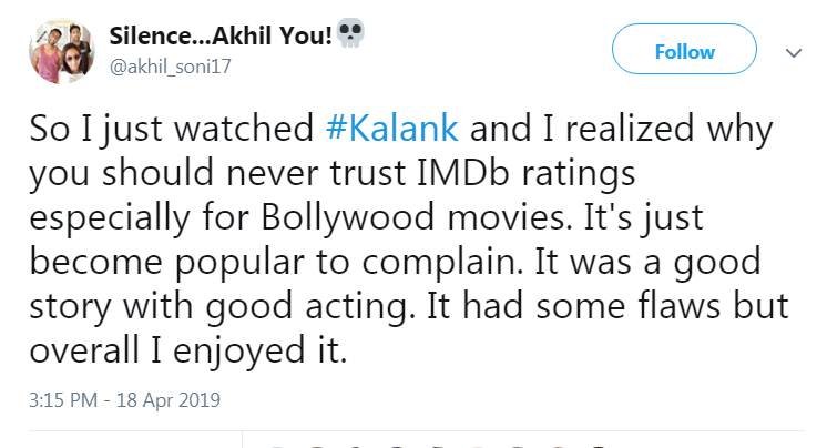 कलंक 3 को जहां कुछ लोग नापसंद कर रहे हैं तो वहीं कुछ लोगों को यह फिल्म खूब पसंद आ रही है। लोग फिल्म की तारीफ भी सोशल मीडिया पर कर रहे हैं।