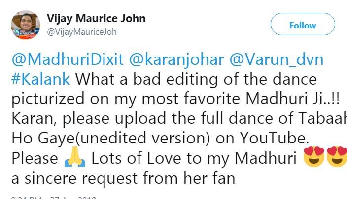 माधुरी दीक्षित के फैन्स करण जौहर ने गुजारिश कर रहे हैं कि उनकी चहेती एक्ट्रेस का गाना तबाह हो गए का वीडियो सोशल मीडिया पर अपलोड किया जाए।