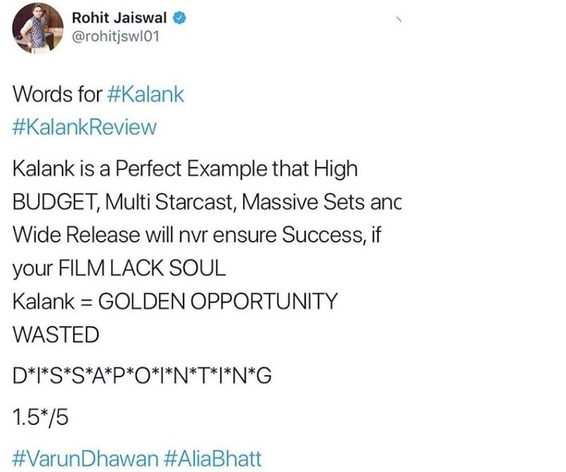 दर्शक इस फिल्म को फ्लॉप बता रहे हैं। तो कुछ कह रहे हैं कि ये फिल्म फ्लॉप नहीं डिजास्टर है। कलंक को किसी भी क्रिटिक ने 2 से ज्यादा स्टार्स नहीं दिए हैं।