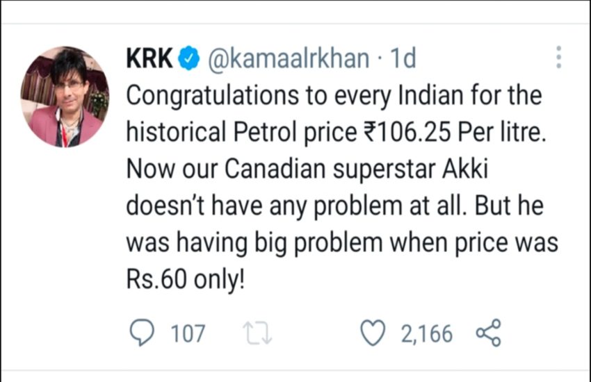 केआरके ने अपने ट्विटर अकाउंट से ट्वीट किया, ‘106.25 रुपए प्रति लीटर पेट्रोल की कीमत में ऐतिहासिक उछाल के लिए हर देशवासी को बधाई। अब हमारे कनाडाई सुपरस्टार अक्षय कुमार को कोई दिक्कत नहीं है लेकिन जब पेट्रोल केवल 60 रुपए था तब उन्हें दिक्कत हो रही थी।’