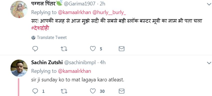 कमाल आर खान ने लिखा- ‘मैंने साल 2008 में फिल्म देशद्रोही की थी। आज 10 सालों के बाद भी लोग इसके बारे में बात करते हैं। इससे यह साबित होता है कि यह कितनी बड़ी ब्लॉकबस्ट थी।’ कमाल के इस ट्वीट के बाद लोग कमेंट बॉक्स में उनका मजाक उड़ा रहे हैं। एक सोशल मीडिया यूजर ने लिखा-‘ सर! आपकी वजह से आज मुझे सदी की सबसे बड़ी ब्लॉक बस्टर मूवी का नाम भी पता चला #देशद्रोही।’ वहीं एक अन्य यूजर लिखते हैं- ‘सर संडे को मत लगाया करो प्लीज।’ वहीं एक अन्य ट्विटर यूजर लिखते हैं- ‘बस यही वाला नशा करना है मुझे।’ एक यूजर लिखते हैं- ‘सर फिल्म के सीक्वल का इंतजार है।’