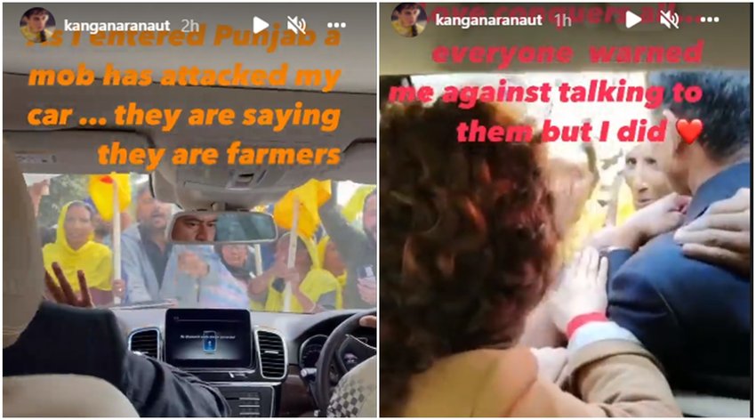 बॉलीवुड की मशहूर एक्ट्रेस कंगना रनौत पंजाब के कीरतपुर में आंदोलनरत किसानों के बीच फंस गईं। किसानों ने उनकी कार को चारों ओर से घेरकर जमकर नारे भी लगाए। इससे जुड़े वीडियो कंगना रनौत ने अपनी इंस्टाग्राम स्टोरी पर साझा किये। वीडियो में एक्ट्रेस ने किसानों पर हमला करने का आरोप लगाया, साथ ही कहा कि मुझे गालियां दी जा रही हैं और जान से मारने की धमकी भी मिल रही है। कंगना रनौत ने वीडियो में कहा कि कार को घेरकर खड़े लोग अपने आपको किसान बता रहे हैं।