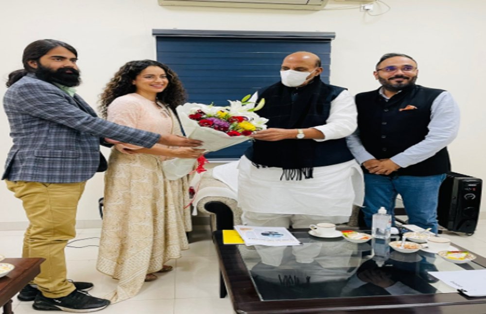 रक्षा मंत्री से गुलदस्तों के साथ मिलने पहुंची कंगना ने ट्विटर पर लिखा, ‘आज टीम तेजस माननीय रक्षा मंत्री राजनाथ सिंह से मिली और उनका आशीर्वाद लिया। हमने उनके साथ फिल्म की स्क्रिप्ट शेयर की। साथ ही फिल्म की स्क्रिप्ट भारतीय वायु सेना को सौंप दी है और कुछ अनुमति भी मांगी है। जय हिंद!’ राजनाथ सिंह से मिलने कंगना के साथ उनकी बहन रंगोली चंदेल भी गईं थीं।
