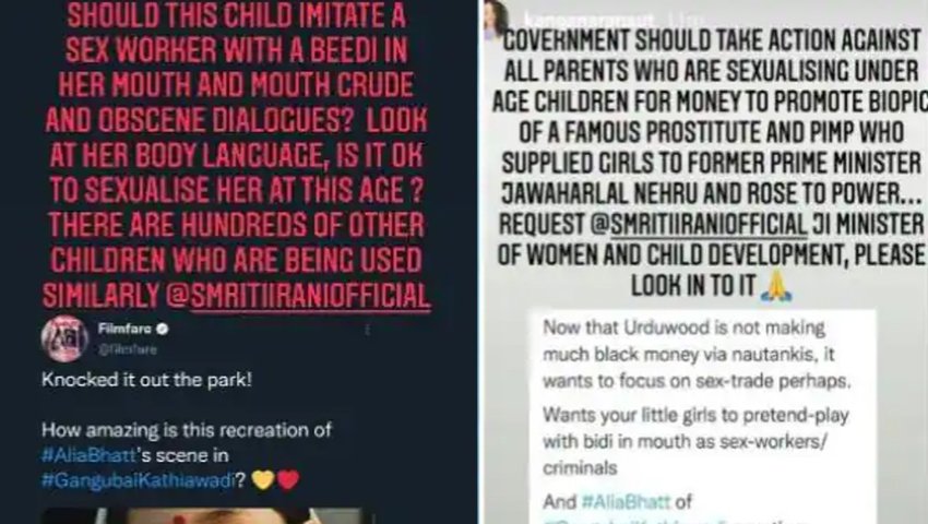 कंगना ने इंस्टाग्राम पर इस वीडियो को शेयर करते हुए लिखा, ”क्या इस बच्ची को मुंह में बीड़ी रखकर घटिया और भद्दे डायलॉग बोलकर सेक्स वर्कर की नकल करनी चाहिए? इसकी बॉडी लैंग्वेज देखिए, क्या इस उम्र में इसे सेक्सुअलाइज करना ठीक है? सैकड़ों बच्चे हैं जिनका ऐसे ही इस्तेमाल किया जा रहा है।’ इसके साथ ही कंगना ने इस पोस्ट में महिला एवं बाल विकास मंत्री स्मृति ईरानी को भी टैग किया है।