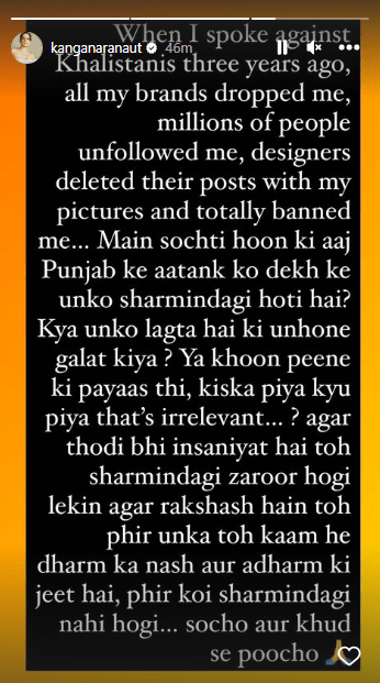 कंगना रनौत ने हाल ही मैं फेसबुक पर पोस्ट करते हुए लिखा कि ‘जब मैंने तीन साल पहले खालिस्तानियों के खिलाफ बोला था तो मेरे सभी ब्रांड्स ने मुझे हटा दिया था। लाखों लोगों ने मुझे अनफॉलो कर दिया था। डिजाइनरों ने मेरी फोटोज के साथ अपनी पोस्ट हटा दी थी और पूरी तरह से मुझे बैन कर दिया था। मैं सोचता हूं कि आज पंजाब के आतंक को देखकर उनको शर्मिंदगी होती है? क्या उनको लगता है कि उन्होंने गलत किया।’