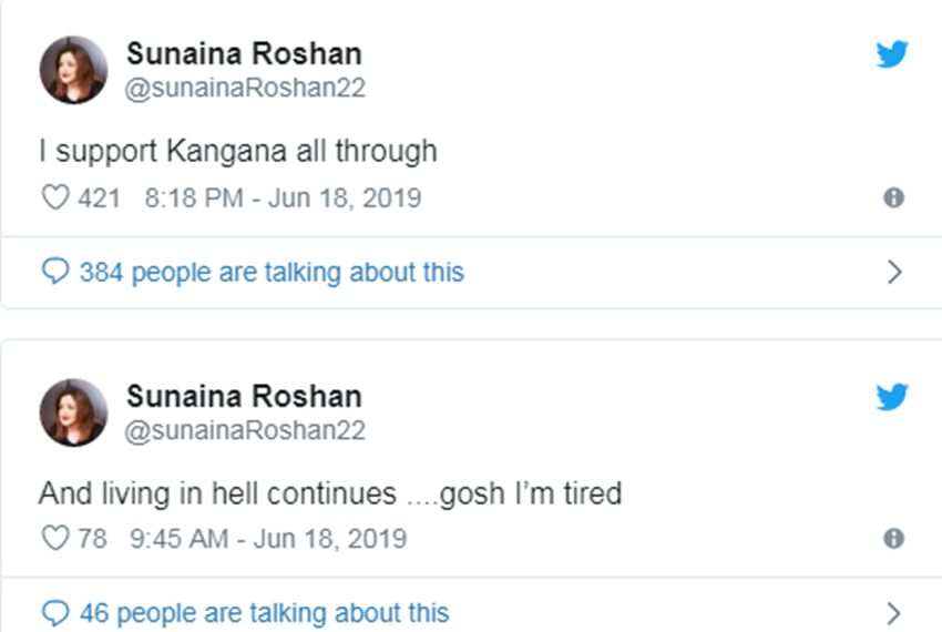 वहीं सुनैना ने भी एक ट्वीट में लिखा है कि वह कंगना रनौत का समर्थन करती हैं। कंगना ने मुंबई मिरर से बातचीत में कहा था, ”सुनैना और मैं अच्छे दोस्त हैं। लेकिन अब वह लोग (रोशन परिवार) कुछ और ही दावा कर रहे हैं। हां, वह मुझसे अभी भी टच में है। लेकिन मैं उनके परिवार की लड़ाई का फायदा नहीं उठाना चाहती। सुनैना अभी भी मेरी दोस्त हैं।”