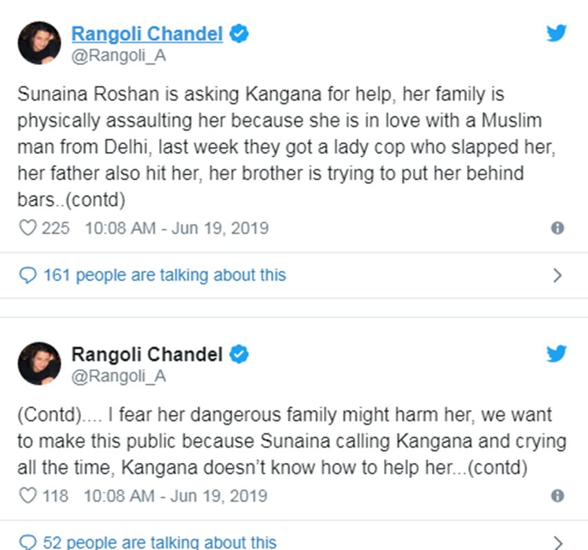 रंगोली ने एक ट्वीट में लिखा- ‘सुनैना रोशन कंगना से मदद मांग रही हैं क्योंकि उनका परिवार दिल्ली के एक मुस्लिम लड़के से प्यार करने पर शारीरिक प्रताड़ना दे रहा है। बीते सप्ताह उन्होंने एक महिला पुलिसकर्मी को बुलाया था, जिसे सुनैना को थप्पड़ जड़ा था। उसके पिता ने भी उसपर हाथ उठाया था। उसके भाई ने भी बार की ओर धक्का देने की कोशिश की थी। मुझे डर है कि उसका खतरनाक परिवार उसे नुकसान पहुंचाने की कोशिश कर रहा है। मैं इसलिए इसे सार्वजनिक कर रही हूं क्योंकि सुनैना कंगना को फोन कर रो रही हैं। कंगना को समझ नहीं आ रहा है कि वह उसकी कैसे मदद करें?’