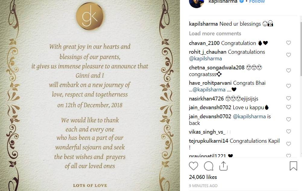 कपिल शर्मा ने अब अपने फैन्स के संग शादी की तारीख को भी साझा कर दिया है। कपिल ने एक इंस्टा हैंडल पर एक कार्ड पोस्ट करते हुए लिखा- ‘माता-पिता के आशीर्वाद से मैं और गिन्नी 12 दिसंबर से एक साथ नई यात्रा शुरु करने वाले हैं। हम दोनों आप सभी के प्यार और इस यात्रा में साथ देने के लिए धन्यवाद कहते हैं।’ कपिल की शादी की तारीख सामने आने के बाद उनके फैन्स कमेंट कर बधाई दे रहे हैं। रिपोर्ट्स के मुताबिक, कपिल शर्मा के शो का नया सीजन पहले दीवाली के मौके पर शुरु होने वाला था। हालांकि बाद में कपिल की शादी को लेकर शो की तारीख को आगे खिसका दिया गया था।