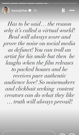 करण जौहर ने अपनी इंस्टाग्राम स्टोरी पर लिखा, “यह कहना जरूरी है… इसी वजह से इसे वर्चुअल वर्ल्ड कहा जाता है! असल दुनिया हमेशा जीतती है और सोशल मीडिया का शोर खुद-ब-खुद बेअसर साबित हो जाता है।” उन्होंने आगे कहा, “आप किसी कलाकार को उसकी स्माइल के लिए ट्रोल कर सकते हैं, लेकिन जब फिल्म रिलीज होकर हाउसफुल थिएटर्स में चलती है और उसे सच्चा दर्शक प्रेम मिलता है, तो वही कलाकार मुस्कुराता है। नोइसमेकर्स और क्लिकबेट ढूंढने वाले लोग जो चाहें कर लें… सच्चाई हमेशा सामने आती है।”