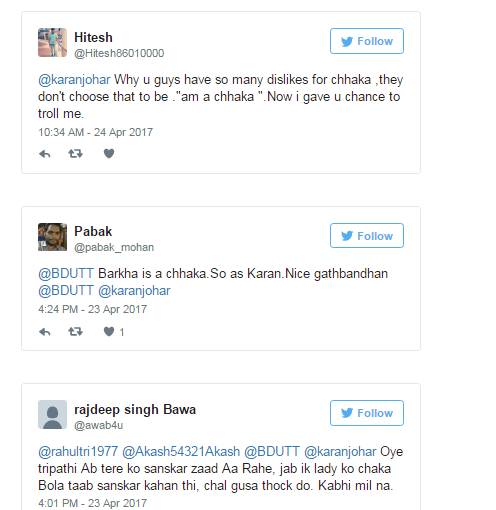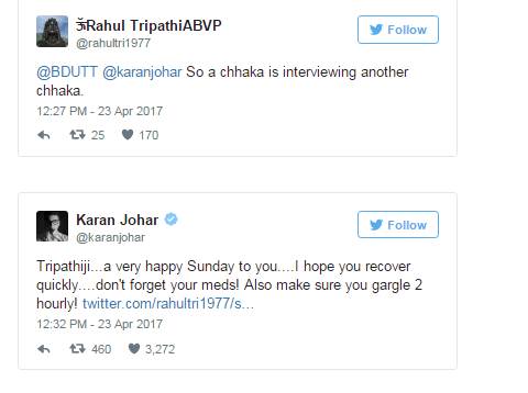 फिल्मकार करण जौहर ने ट्विटर पर एक व्यक्ति द्वारा ‘छक्का’ कहे जाने का करारा जबाव देते हुए कहा कि उन्हें उम्मीद है कि छक्का कहने वाला शख्स जल्द ही ठीक हो जाएगा। एक पत्रकार के साथ करण के साक्षात्कार वाले वीडियो पर टिप्पणी करते हुए एक यूजर ने कहा, “एक छक्का दूसरे छक्के का इंटरव्यू ले रहा है। यूजर को करारा जवाब देते हुए करण ने ट्वीट किया, मैं उम्मीद करता हूं कि आप जल्द ठीक हो जाएंगे। अपनी दवाइयां लेना ना भूलें। यह पहली बार नहीं है, जब ट्विटर पर उनका मजाक उड़ाया गया हो। सेरोगेसी की मदद से पिता बने करण ने इससे पहले एक साक्षात्कार में कहा था कि ट्विटर पर कई बार उनका मजाक उड़ाया जा चुका है।
