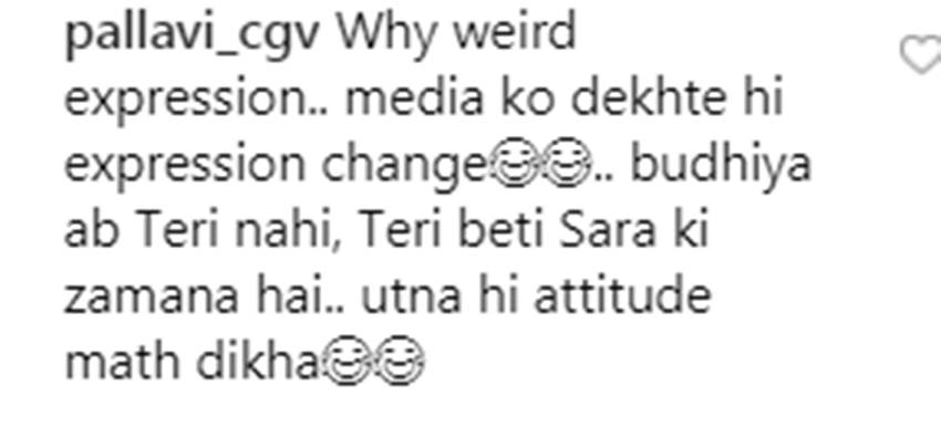 एक सोशल मीडिया यूजर ने लिखा- यह हमेशा इतने वियर्ड फेस क्यों बनाती है? वहीं एक अन्य यूजर लिखता है- इसके पास इतना एडीट्यूड क्यों है, यह अच्छा नहीं है। वहीं एक इंस्टाग्राम यूजर ने लिखा- मीडिया को देखते ही एक्सप्रेशन्स चेंज। वहीं एक इंस्टा यूजर लिखता है- मुंह में रजनीगंधा कदमों में दुनिया। एक यूजर ने लिखा- एडीट्यूड तो देखो इनका। करीना के इस वीडियो को जाने-माने फोटो जर्नलिस्ट विरल भियानी ने शेयर किया है।