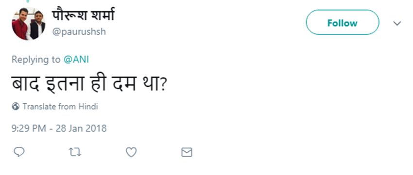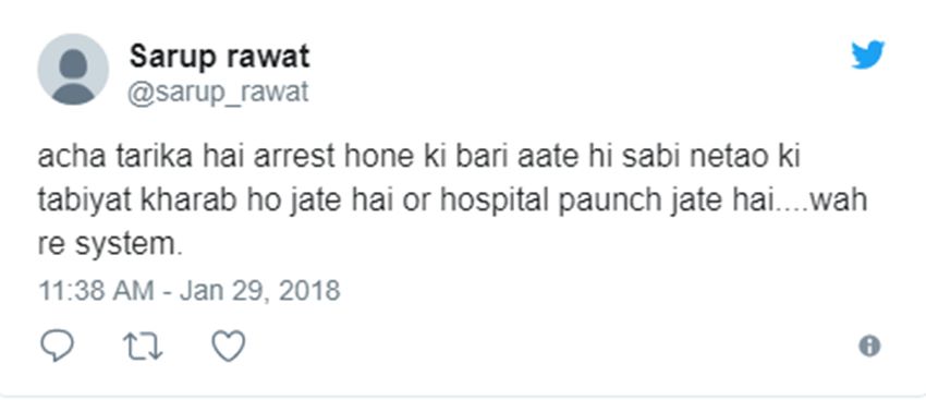 स्वरुप रावत नाम के एक ट्विटर अकाउंट यूजर ने लिखा, अच्छा तरीका है अरेस्ट होने की बारी आते ही सभी नेताओं की तबीयत खराब हो जाती है और अस्पताल पहुंच जाते हैं.. वाह रे सिस्टम। पौरुश शर्मा नाम का एक यूजर लिखता है, इतना ही दम था। शैक्यूब नाम के यूजर ने लिखा, तिहाड़ जाने की बारी आई तो बीमार हो गया। फिल्म को दर्शक पसंद भी कर रहे हैं और बॉलीवुड स्टार्स दीपिका पादुकोण, शाहिद कपूर और रणवीर कपूर की तारीफ भी कर रहे हैं।