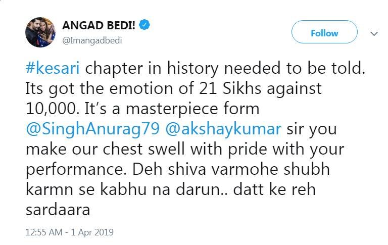 अक्षय कुमार की केसरी दर्शकों के अलावा सेलेब्स को भी खूब पसंद आ रही है। एक्टर अंगद बेदी ने एक ट्वीट में केसरी फिल्म की जमकर तारीफ की है।