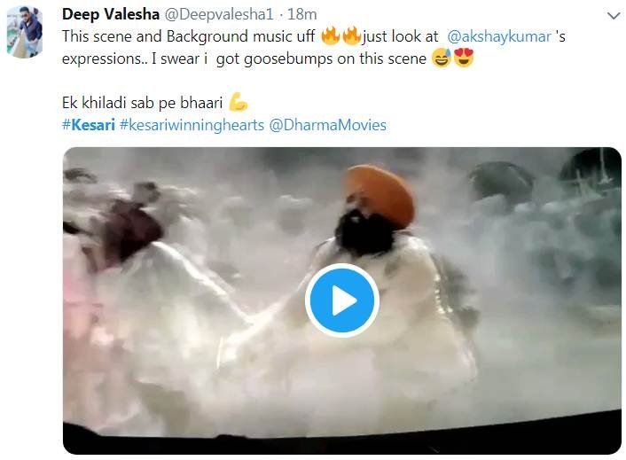 केसरी को देखने के बाद लोग अक्षय कुमार के एक्सप्रेशन्स की भी जमकर तारीफ कर रहे हैं। एक यूजर ने लिखा कि फिल्म में अक्षय के एक्सप्रेशन्स को देखकर उसके रोंगटे खड़े हो गए।