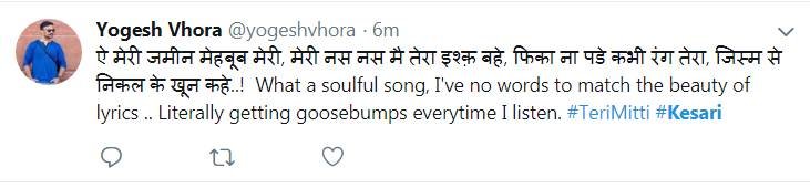 अक्षय की केसरी लोगों का दिल जीतने में कामयाब हो रही है। फिल्म को देखने के बाद लोगों का कहना है कि उनके रोंगटें खड़े हो गए। इसके अलावा लोग फिल्म का डायलॉग भी सोशल मीडिया पर शेयर कर रहे हैं।