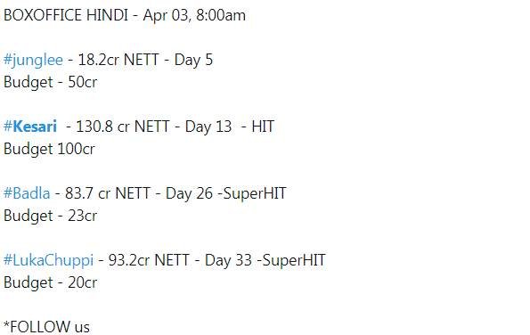 अक्षय कुमार की केसरी बॉक्स ऑफिस पर हिट साबित हुई है। 100 करोड़ के बजट से तैयार फिल्म ने अबतक 128 करोड़ से ज्यादा की कमाई कर ली है। जानिए इस साल रिलीज हुई अन्य फिल्मों का हाल-