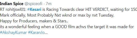 अक्षय कुमार की केसरी को रिलीज के 15 दिनों के बाद भी दर्शक मिल रहे हैं। यही कारण है कि फिल्म बॉक्स ऑफिस पर जबरदस्त कमाई करने में भी सफल हो रही है। एक यूजर ने लिखा- मुझे लगा था कि फिल्म को देखने में मैंने देरी कर दी है। लेकिन मैं गलत थी क्योंकि सिनेमाघरों में काफी भीड़ थी।