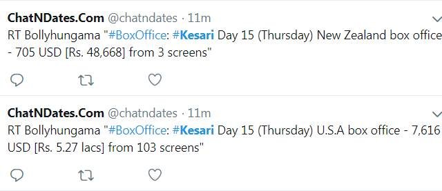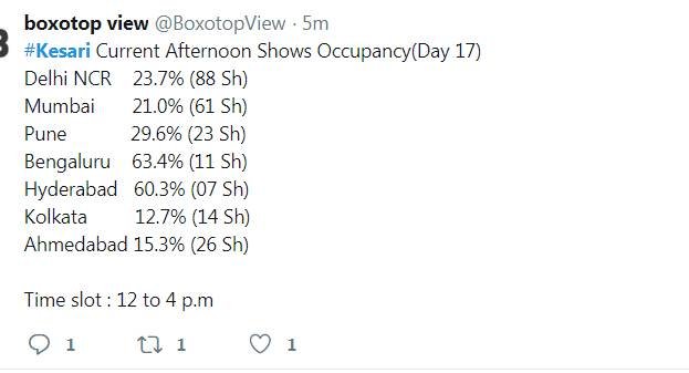 लोगों के सिर केसरी का खुमार चढ़ा हुआ है। कई सारे लोगों ने सोशल मीडिया पर बताया है कि वह फिल्म को तीन-तीन देखकर आ चुके हैं। इतना ही नहीं रिलीज के तीसरे वीक में भी लोग फिल्म का पोस्टर शेयर कर तारीफ कर रहे हैं।