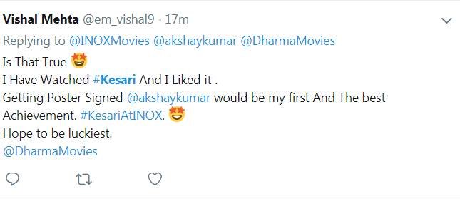 अक्षय कुमार की केसरी का लोगों के बीच क्रेज बरकरार है। एक यूजर ने लिखा- मैंने अभी केसरी को देखा और मुझे फिल्म पसंद आई। अक्षय कुमार का साइन किया हुआ पोस्टर भी मिला। यह मेरे लिए सबसे बड़ा गिफ्ट है।