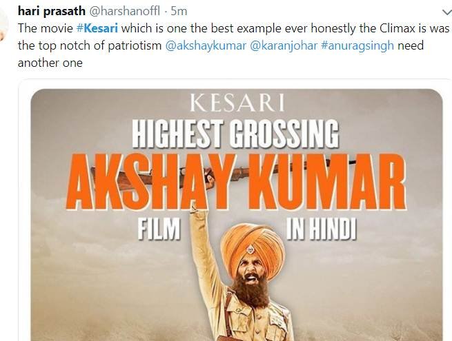 फैन्स को अक्षय कुमार की फिल्म केसरी खूब पसंद आ रही है। लोगों का कहना है कि उनके लिए केसरी अक्षय कुमार की अबतक की सबसे बेस्ट फिल्म है।