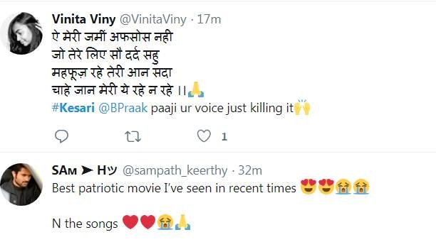 सोशल मीडिया पर केसरी को लेकर लोग जबरदस्त रिएक्शन दे रहे हैं। लोगों का कहना है फिल्म में सच्चाई और साहस दिखाया गया है। वह ऐसी और फिल्मों को देखना चाहते हैं।