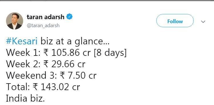 अक्षय कुमार की केसरी ने पहले वीक में 105 करोड़ 86 लाख रुपए, दूसरे वीक में 29 करोड़ 66 लाख रुपए और तीसरे वीक में अबतक 7 करोड़ 50 लाख रुपए की कमाई की है। इस हिसाब से फिल्म का कुल कलेक्शन 143 करोड़ 2 लाख रुपए हो गया है।