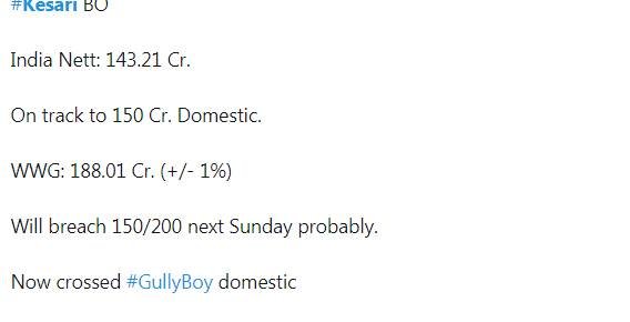 मीडिया रिपोर्ट्स के मुताबिक, केसरी ने भारत में 143 करोड़ 21 लाख रुपए की कमाई कर ली है। इसी के साथ फिल्म 150 करोड़ रुपए के बेहद नजदीक पहुंच गई है। फिल्म ने रणवीर सिंह की गली बॉय के लाइफटाइम कलेक्शन 140 करोड़ को पछाड़ दिया है।