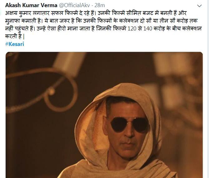 अक्षय कुमार की फिल्म केसरी बॉक्स ऑफिस पर अच्छा प्रदर्शन कर रही है। फिल्म की सफलता से खुश फैन्स अक्षय कुमार की तारीफ के पुल बांध रहे हैं।