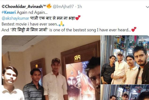 अक्षय कुमार की केसरी को एक बार नहीं बल्कि बार-बार देखने के लिए दर्शक सिनेमाघरों का रुख कर रहे हैं। अक्षय के फैन्स ने सोशल मीडिया पर तस्वीरों को शेयर कर इस बात की जानकारी दी है।