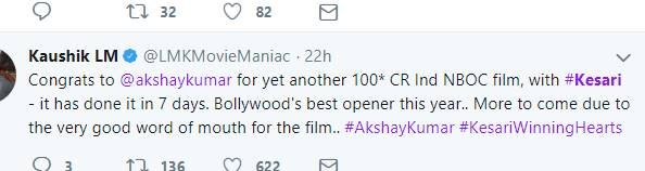 फिल्म केसरी अब तक कई रिकॉर्ड्स बना चुकी है। पहला- अक्षय की अब तक की बेस्ट ओपनर फिल्म। दूसरा- साल की बेस्ट ओपनर फिल्म और तीसरा- इस साल की सबसे पहले और कम दिनों में 100 करोड़ कमाने वाली फिल्म बनी केसरी