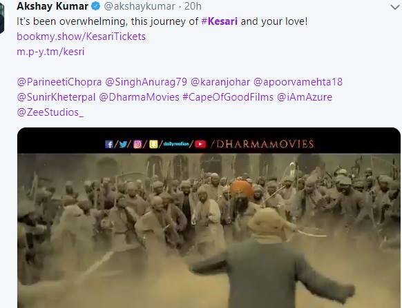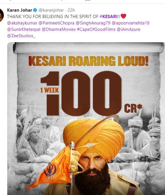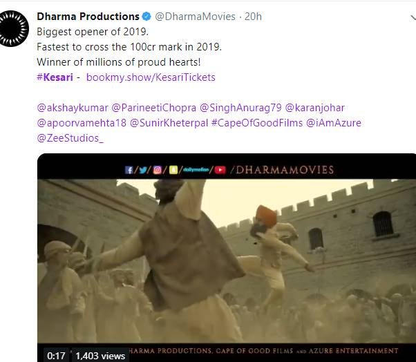 धर्मा प्रोडक्शन ने भी फिल्म केसरी की सक्सेस के लिए फैन्स को शुक्रिया कहा है। वहीं बताया है कि साल 2019 की बिगेस्ट ओपनर है केसरी।