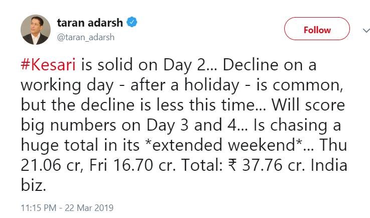 #Kesari is solid on Day 2… Decline on a working day – after a holiday – is common, but the decline is less this time… Will score big numbers on Day 3 and 4… Is chasing a huge total in its *extended weekend*… Thu 21.06 cr, Fri 16.70 cr. Total: ₹ 37.76 cr. India biz.