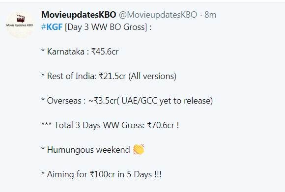 KGF फिल्म को माउथ पब्लिसिटी का भी फायदा मिल रहा है और लोग सिनेमाघरों का रुख कर रहे हैं। ऐसा माना जा रहा है कि आने वाले समय में KGF की कमाई में बढ़ोत्तरी हो सकती है।