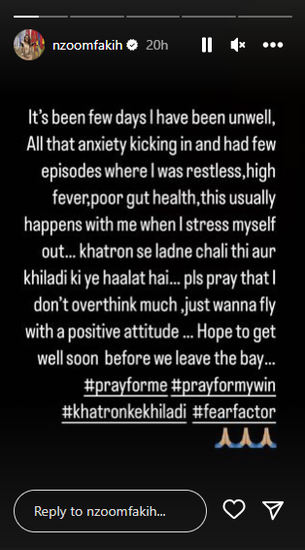 अंजुम ने इंस्टाग्राम स्टोरी पर एक नोट लिखा है। जो है,”कुछ दिन हो गए हैं मेरी तबीयत ठीक नहीं चल रही है। मुझे एंग्जायटी हो रही है और कई बार मैं थका हुआ महसूस कर रही हूं। तेज बुखार, खराब हेल्थ, यह मेरे साथ आमतौर पर तब होता है जब मैं तनाव में होती हूं। खतरों से लड़ने चली थी और खिलाड़ी की ये हालत है। कृपया प्रार्थना करें कि मैं ज्यादा न सोचूं। मैं पॉजिटिविटी के साथ उड़ना चाहती हूं। उम्मीद करती हूं कि शो पर जाने से पहले मैं ठीक हो जाऊं।”