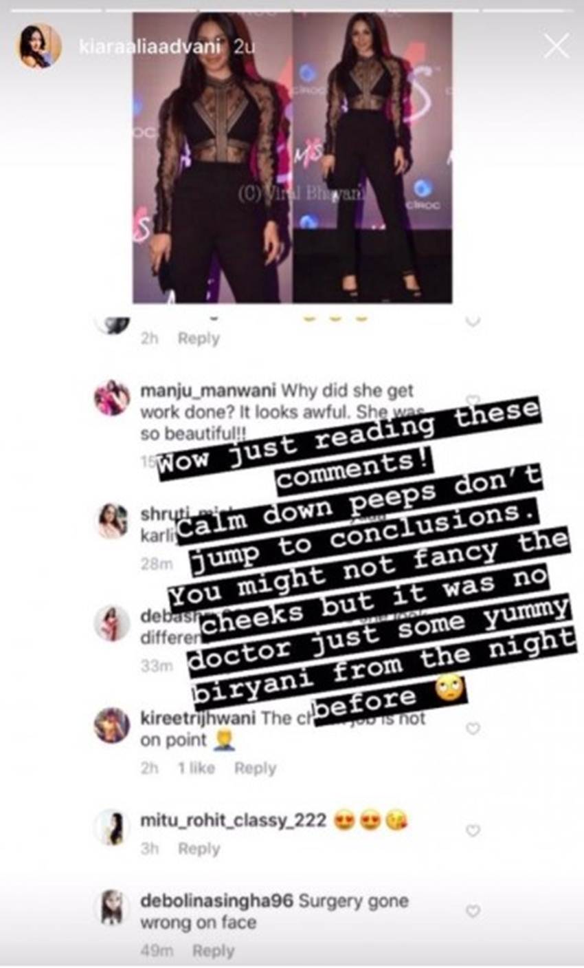 ट्रोल्स को जवाब देते हुए किआरा ने इंस्टा स्टोरी पर अपनी तस्वीर शेयर करते हुए कैप्शन लिखा- वाउ, अभी इन कमेंट्स को पढ़ा। आप लोग शांत हो जाइए और किसी भी निष्कर्ष पर मत पहुंचे। शायद आपके पास ऐसे गाल नहीं है। लेकिन यहां कोई भी डॉक्टर नहीं है। बीती रात को मैंने यमी बिरयानी खाई थी। इसके साथ ही एक्ट्रेस ने एक इमोजी का भी इस्तेमाल किया है।
