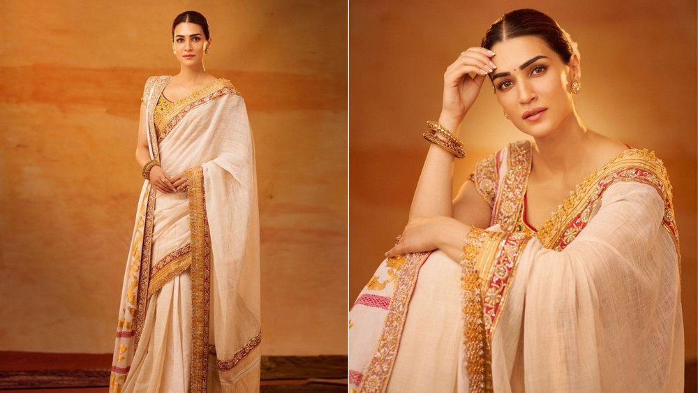 एक्ट्रेस ने सफेद साड़ी के साथ अपनी सादगी से लुक को कंप्लीट किया है। कृति ने बालों में सफेद फूल भी लगाया है साथ ही ओपन प्लीट्स में ड्रैप किया था। उनके माथे पर बिंदी और ब्राउन शेड की सॉफ्ट स्मोकी आईज उनकी खूबसूरती में चार चांद लगा रही है। उनका ट्रैडिशनल और सादगी भरा लुक फैंस का दिल जीत रहा है। कृति के इस लुक और साड़ी के बारे में डिजाइनर अबु जानी संदीप खोसला ने सोशल मीडिया पर फोटो शेयर करके दी है।