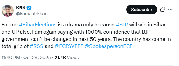 देश में इस वक्त बिहार विधानसभा चुनाव एकमात्र चर्चा का विषय बना हुआ है। ऐसे में एक्टर और फिल्म क्रिटिक कमाल राशिद खान उर्फ केआरके कैसे ना कुछ कहें। उन्होंने एक्स पर एक के बाद ट्वीट कर अपनी राय दी है। उन्होंने ये तक दावा कर दिया है कि ये चुनाव केवल दिखावा है, देश में आने वाले 50 सालों तक बीजेपी की ही सरकार रहने वाली है।