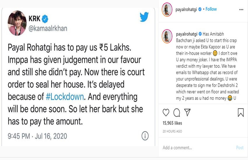 कमाल राशिद खान ने ट्विटर पर लिखा, ‘पायल रोहतगी को हमें 5 लाख रुपए देने हैं। इम्पा (इंडियन मोशन पिक्चर प्रोड्यूसर्स एसोसिएशन) ने हमारे पक्ष में फैसला सुनाया था। लेकिन उन्होंने अभी तक हमें पैसे नहीं लौटाए हैं। अब उनके घर को सील करने का कोर्ट का ऑर्डर है। इसमें लॉकडाउन के कारण देरी हुई है और सब कुछ जल्द ही करवाया जाएगा। तो इसीलिए उसे भौंकने दो मगर उसे पैसे चुकाने पड़ेंगे’।