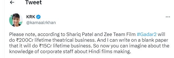 कमाल राशिद खान ने ट्वीट करते हुए लिखा कि ‘प्लीज नोट, शारिक पटेल और ज़ी टीम के मुताबिक फिल्म ‘गदर 2′ 200 करोड़ रुपये का लाइफटाइम थिएट्रिकल बिजनेस करेगी। और मैं एक ब्लैंक पेपर पर लिख सकता हूं कि ये फिल्म 15 करोड़ का लाइफटाइम बिजनेस करेगी। तो अब आप अंदाजा लगा सकते हैं कि हिंदी फिल्म मेकिंग के बारे में कॉरपोरेट स्टाफ की नॉलेज कितनी है।’ बता दें कि ‘गदर 2’ का अभी तक ना तो कोई टीजर रिलीज हुआ है और ना ही कोई ट्रेलर आया है। फिर भी केआरके ने फिल्म के लाइफ टाइम कलेक्शन के बारे में भविष्यवाणी कर दी है।