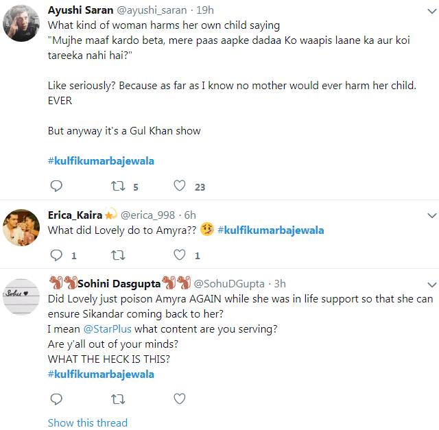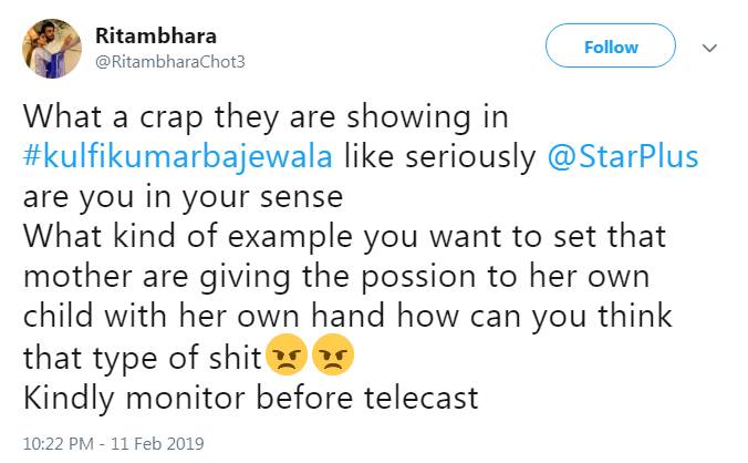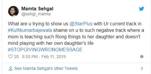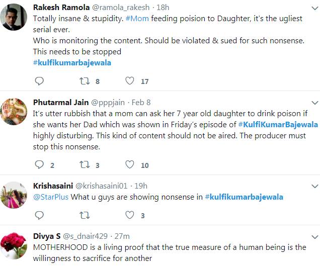 शो को लेकर लोग कितना नाराज है इसका अंदाजा उनके कमेंट्स से लगाया जा सकता है। दर्शक यह बात मानने के लिए राजी नहीं है कि एक मां अपनी बेटी को ही कैसे मौत के मुंह में धकेल सकती है। फैन्स मेकर्स से भी काफी निराश हैं। उनका मानना है कि शो का नया ट्रैक घटिया, बेहूदा और वाहियात है। लोगों ने मेकर्स से अपील की है कि वह इस तरह के ट्रैक पर तुरंत रोक लगा दें।