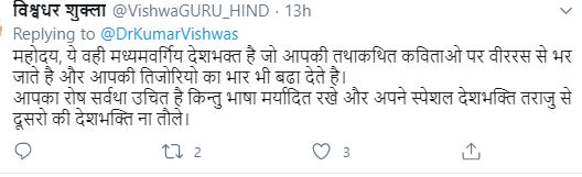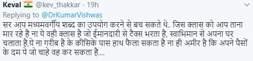 कुमार विश्वास के इस ट्वीट के बाद लोगों ने उन्हें जमकर ट्रोल किया एक यूजर ने कुमार के ट्वीट को रीट्वीट करते हुए लिखा, ‘सर आप मध्यमवर्गीय शब्द का उपयोग करने से बच सकते थे.. जिस क्लास को आप ताना मार रहे है ना ये वही क्लास है जो ईमानदारी से टैक्स भरता है, स्वाभिमान से अपना घर चलाता है,ये ना गरीब है के कीसिके पास हाथ फैला सकता है ना ही अमीर है कि अपने पैसों के दम पे जो चाहे वह कर सकता है।’ वहीं एक अन्य यूजर ने लिखा कि ऐसे मध्यवर्गीय लोग ही आप जैसे लोगों की कविताएं सुनते हैं और आप की तिजोरियों का भार भी ढोते हैं तो आपकी मध्यवर्गीयों को लेकर सोच सही नहीं है।’