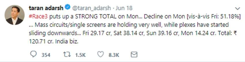 तरण आदर्श के मुताबिक, सोमवार तक रेस-3 ने अच्छी खासी कमाई कर ली। बड़े सर्किट्स और सिंगल स्क्रीन्स पर यह अच्छी कमाई कर रही है। वहीं, एक अन्य एनालिस्ट रमेश बाला बोले कि शुरुआत चार दिनों में फिल्म ने 200 करोड़ रुपए का ग्रॉस बिजनेस दुनिया भर में किया है।
