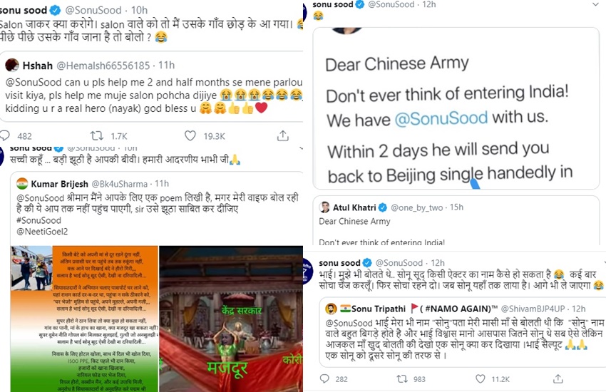 एक अन्य ने कहा-‘‘सोनू सूद भैया, एक बार गर्लफ्रेंड से ही मिलवा दीजिए, बिहार ही जाना है।’ इस पोस्ट को देख कर कई लोगों ने उस शख्स की अच्छे से खबर ली और फटकार लगाते हुए कहा- ‘तुमको मजाक सूझ रहा है, जरा सड़कों पर जाकर देखो, पता चलेगी मजदूरों की हालत। तो किसी ने कहा- ‘भाई ऐसा मजाक मत करो। सर जी अपना काम कर रहे हैं। बहुत से लोग घर जाना चाहते है क्यों उनका समय बर्बाद कर रहे हो।’