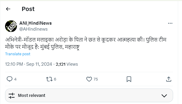 एएनआई ने इस खबर की जानकारी आधिकारिक ट्विटर अकाउंट पर दी है, जिसमें बताया गया है कि एक्ट्रेस के पिता अनिल मेहता ने बांद्रा में सुबह बिल्डिंग की छठी मंजिल से कूदकर आत्महत्या की है और ये खबर आग की तरह फैल गई है।